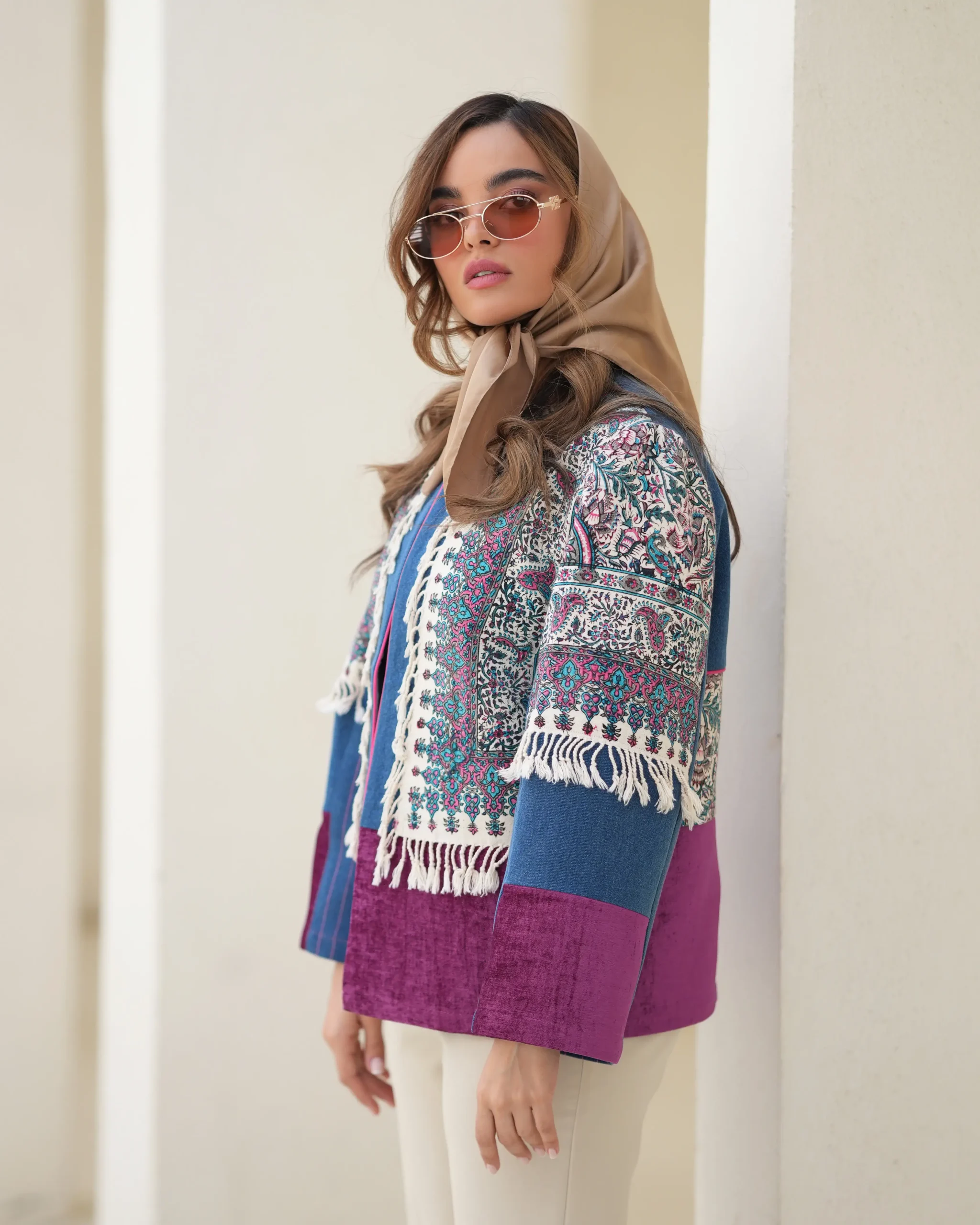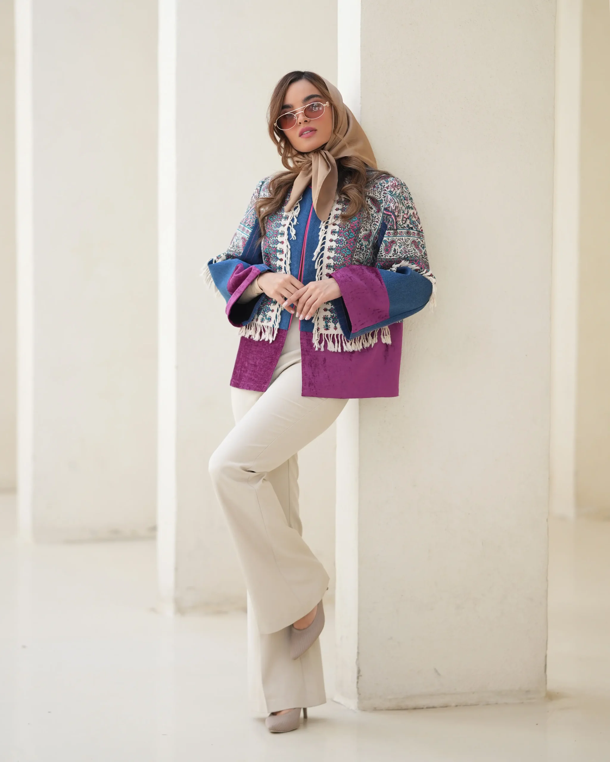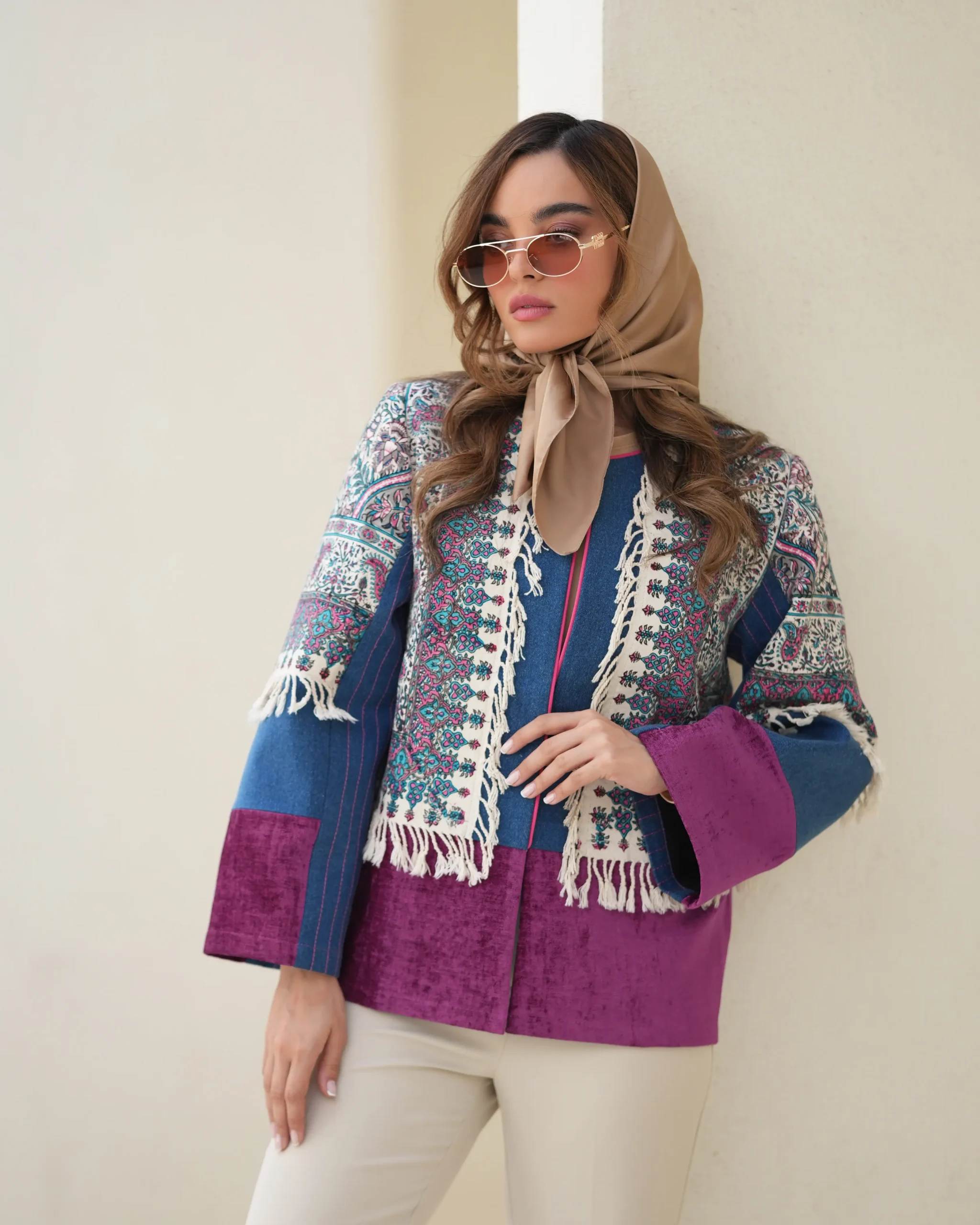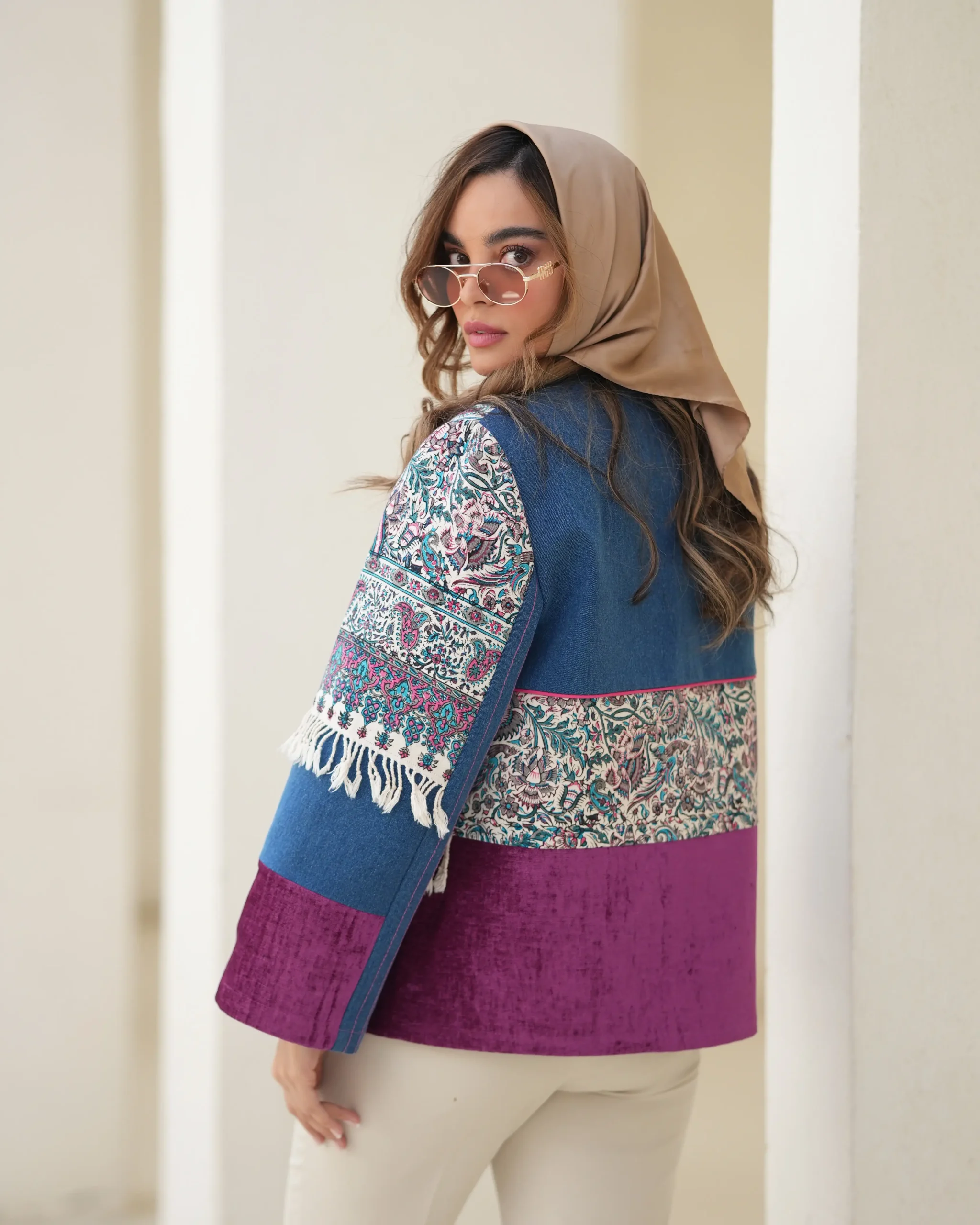 مانتوترکیبی از پارچه های چاپ دست ، که نمایانگر هنر و اصالت ایرانی هستند و هرکدام امضای ایران هستند قد کار حدود ۷۰ فری برای ۳۸ الی ۴۲